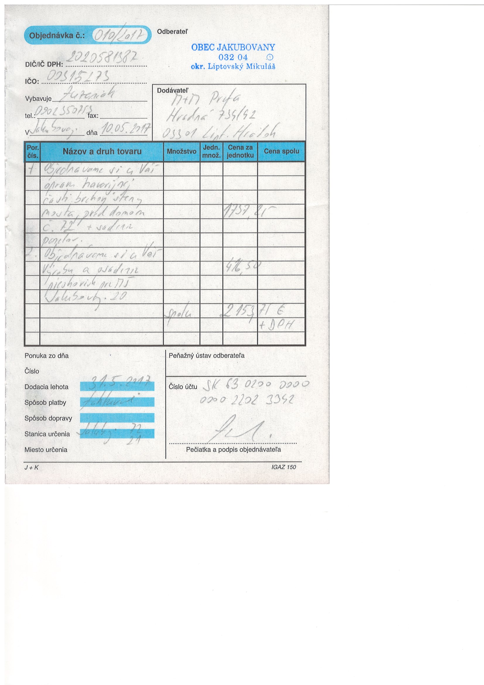 - Číslo objednávky010/2017