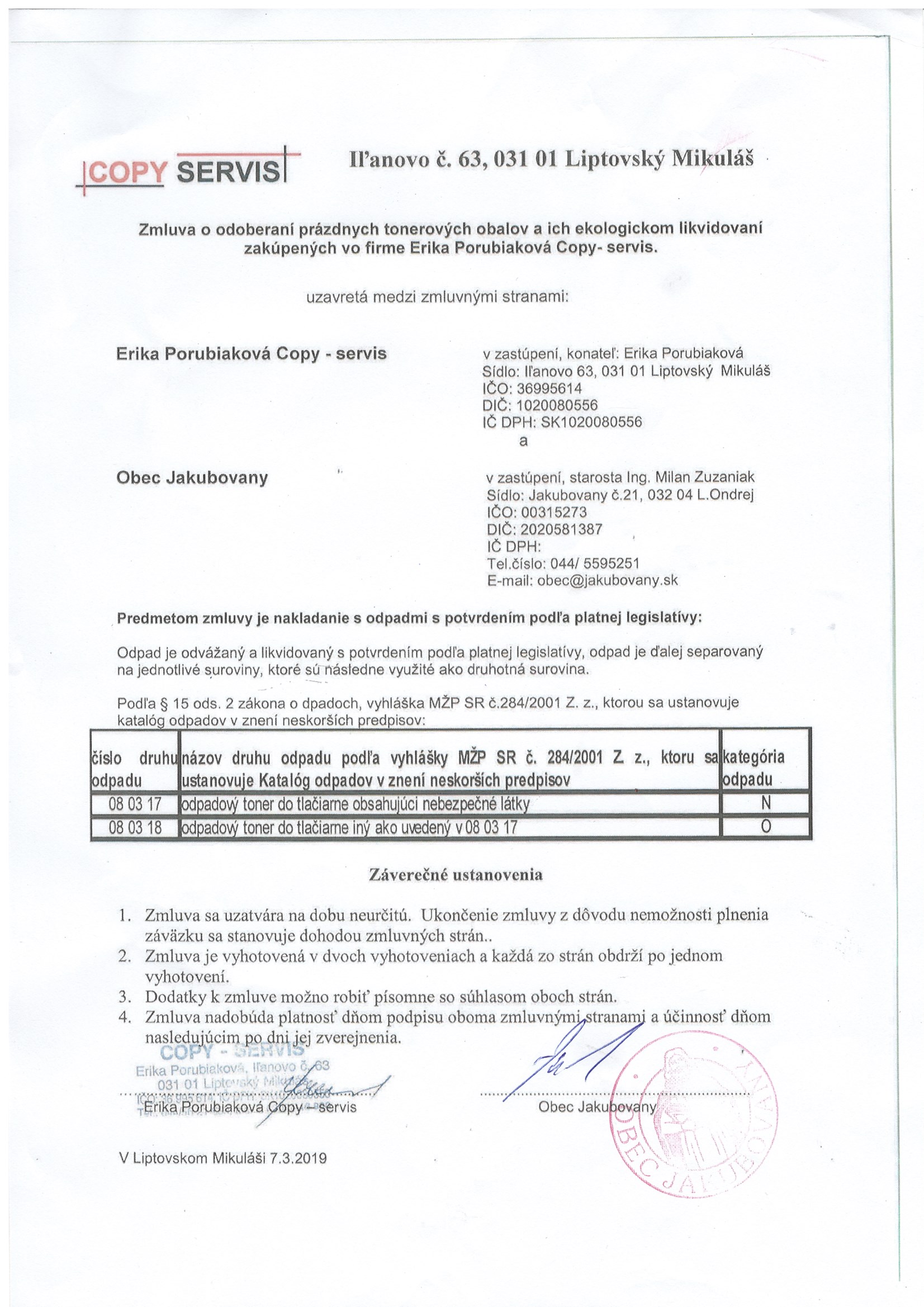 - Predmet zmluvyZmluva o odoberaní prázdnych tonerových obalov, ktoré boli zakúpené vo firme Copy -servis